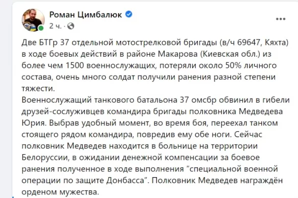 "Военнослужащий, выбрав удобный момент во время боя, переехал танком командира бригады, полковника Юрия Медведева, повредив ему обе ноги", – написал Цимбалюк. Сейчас Медведев находится в больнице в Беларуси.